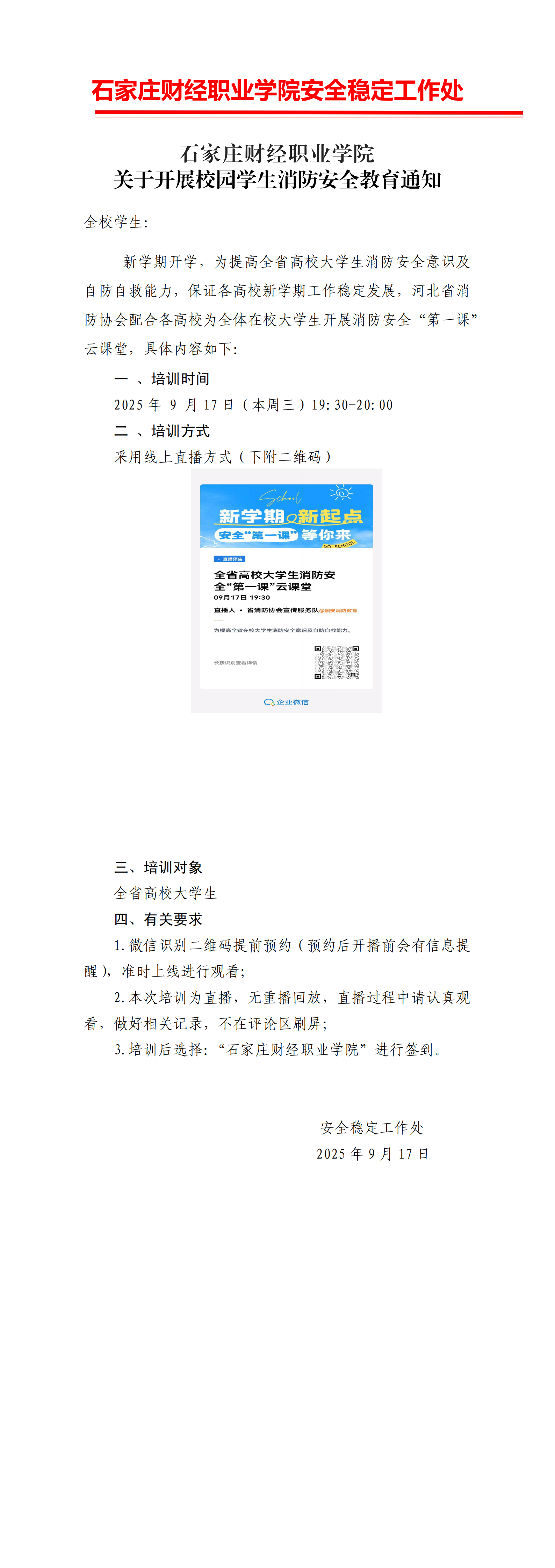 石家庄财经职业学院 关于开展校园学生消防安全教育通知