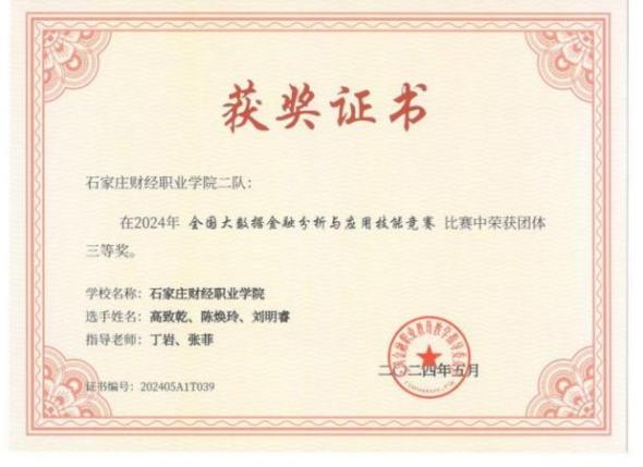 全国大数据金融分析与应用技能竞赛团体三等奖