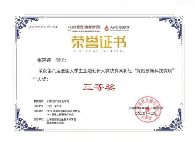 第八届全国大学生金融创新大赛决赛高职组“保险创新科技赛项”个人三等奖