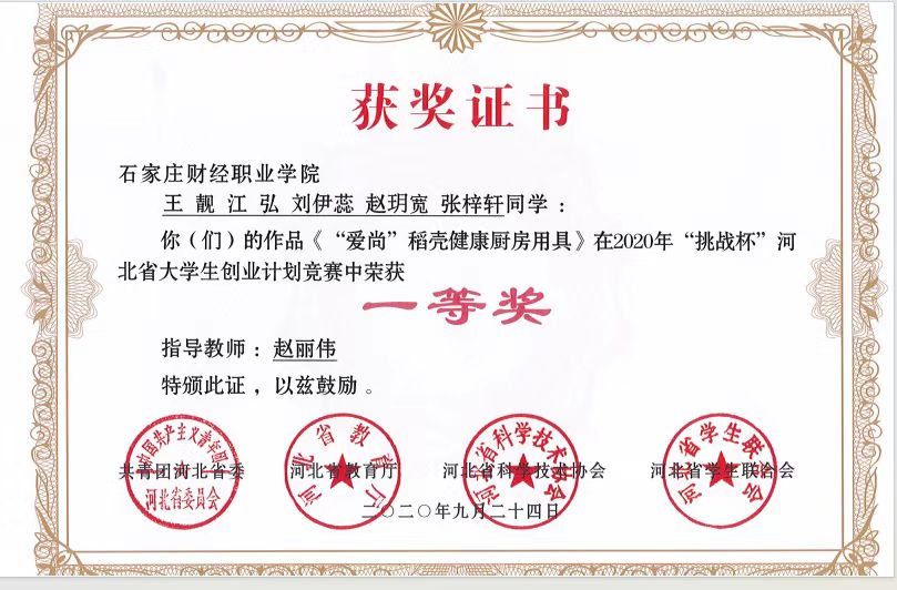 2020年"挑战杯“河北省大学生创业计划竞赛一等奖