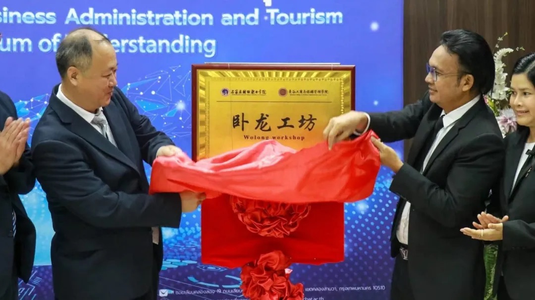 1月13日,学校与泰国院校、中国企业共建的海外办学项目“卧龙工坊”揭牌仪式在泰国曼谷工商与旅游管理学院成功举行。学校党委书记薛向东,副校长王永利,校长助理赵振新、邓佳星,国际交流与合作中心主任李芳、交通工程学院院长邵菲,河北翼龙航空科技有限公司代表梁祎豪、泰国曼谷工商与旅游管理学院代表以及相关人士出席仪式。