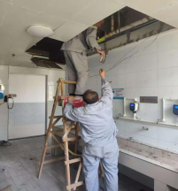 面对卫生间的漏水现象,师傅们在吊顶上仔细排查,他们不顾抬起的脸上沾满落下的灰尘,只想着如何将瓷砖铺得平整。校园里,30个混凝土井圈被重新加固维修,操场损坏的围网也换上了新装,每一处设施的焕新,都藏着他们蹲下身、弯下腰的专注身影。