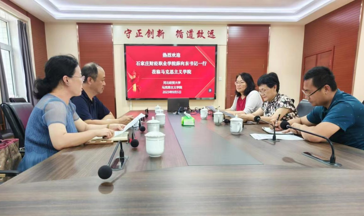 为进一步落实高等学校(以下简称高校)思想政治理论课(以下简称思政课)改革创新,推进我校思政课优质建设,按照河北省教育厅《河北省公办高等学校结对帮扶民办高等学校思想政治理论课建设三年行动方案》相关要求,近日我校党委书记薛向东,马克思主义学院院长崔春静,党政办公室副主任李气柏,教师代表等一行到河北经贸大学就思政课对口帮扶进行交流研讨。河北经贸大学党委书记刘兵与我校党委书记薛向东签订三年帮扶协议。河北经贸大学马克思主义学院院长柴艳萍教授及学院部分领导成员参加了交流活动。