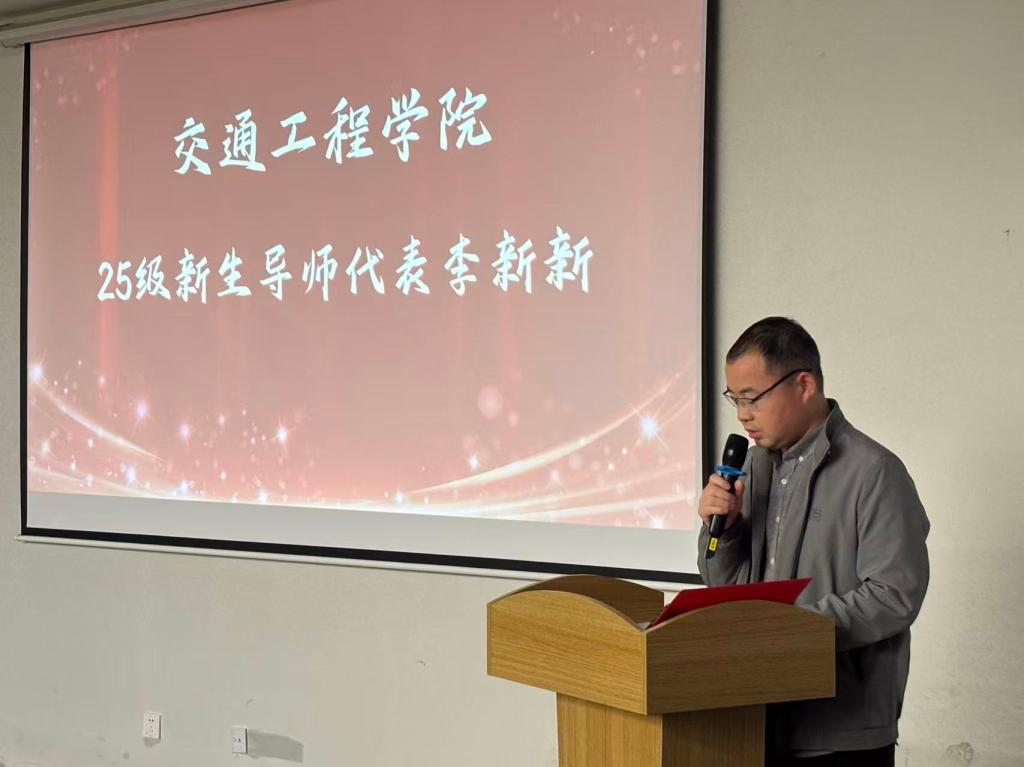 第二项议程,由新生导师代表李新新老师发言,他从多角度阐述了导师职责,承诺将以耐心与责任心陪伴新生成长,助力他们明确发展方向。