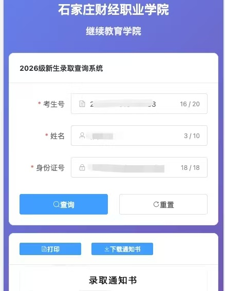 1.登录入口:通过石家庄财经职业学院官网,点击“机构设置-教学机构-继续教育学院-用户登录-录取查询”,进入录取查询系统;