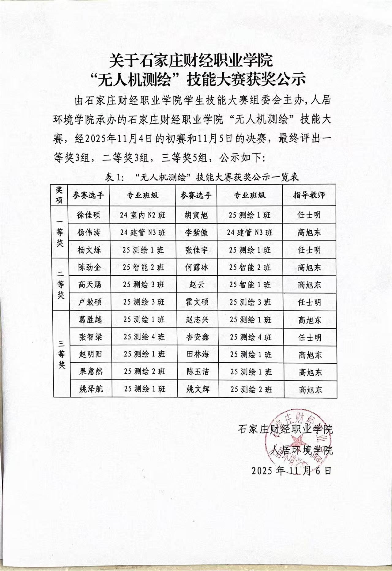 关于石家庄财经职业学院“无人机测绘”技能大赛获奖公示