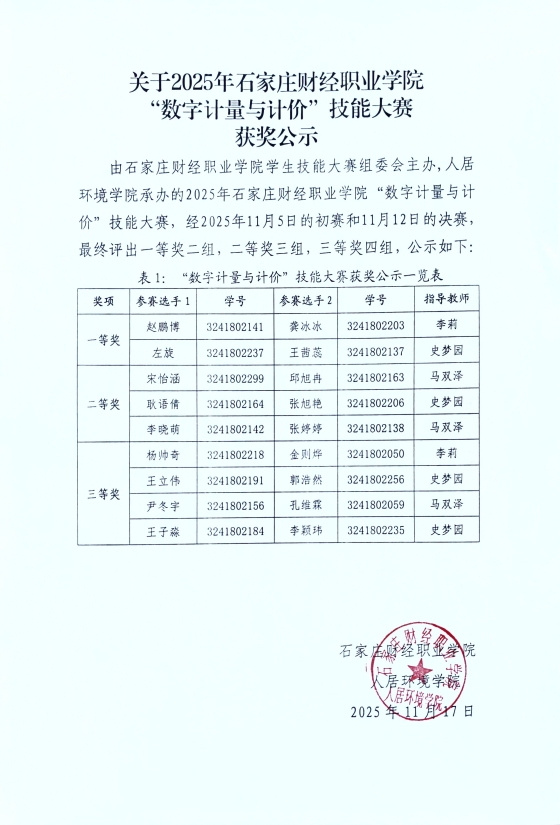 关于2025年石家庄财经职业学院“数字计量与计价”技能大赛获奖公示