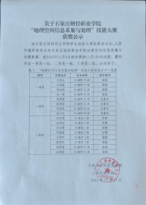 关于石家庄财经职业学院“地理空间信息采集与处理”技能大赛获奖公示