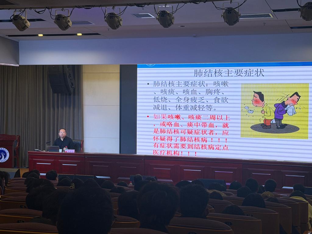 朱建良专家深耕结核病防治领域30余年,原任结核病防治所所长,不仅具备扎实的理论功底,更积累了丰富的校园防控实践经验,曾多次为高校提供专业防控指导。讲座中,他以通俗易懂的语言、贴近校园实际的典型案例,围绕常见传染病的传播途径、高发季节特征、日常防护核心要点等内容展开详细讲解,重点拆解了校园传染病应急处置流程,从风险排查、信息上报到隔离管控、环境消杀等关键环节进行实操性指导,既有理论深度,又具实践价值,为现场师生带来了一堂生动实用的健康课程。