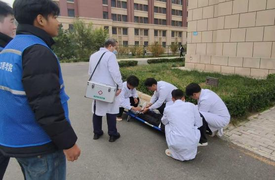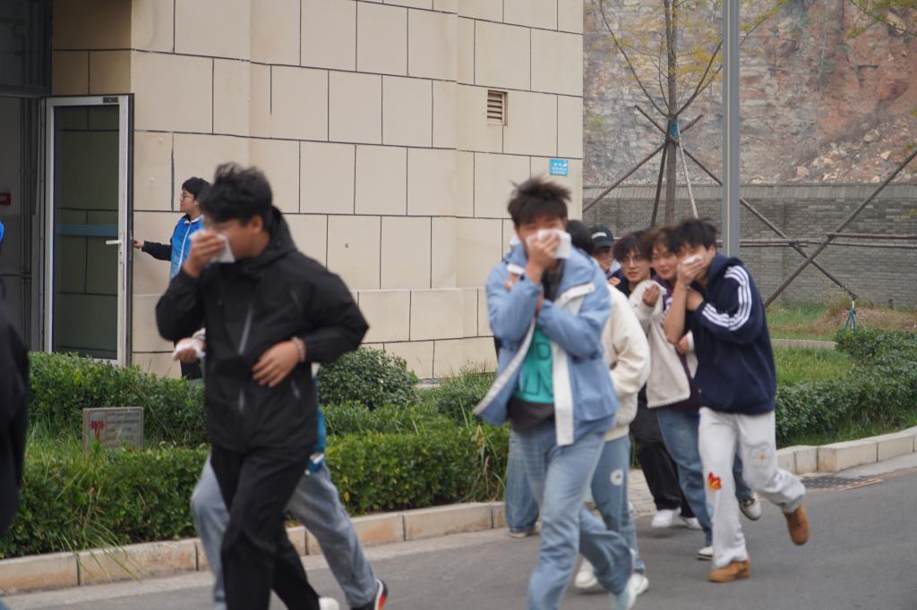 演练于下午1时15分正式开始。随着警报声响起,宿舍楼内的师生迅速反应,按照预定的疏散路线,有序撤离至安全区域。在疏散过程中,师生们展现了良好的组织性和纪律性。各楼层安全员迅速引导学生捂住口鼻、弯腰低姿沿指定路线撤离,安保人员同步启动消防栓、灭火器实操灭火,校医院急救组对“受伤人员”实施转运救治。