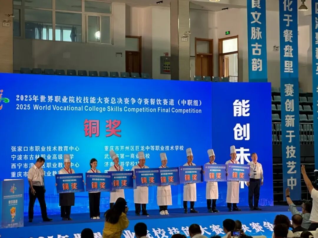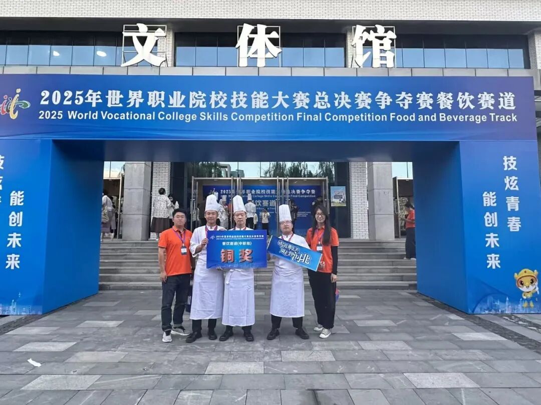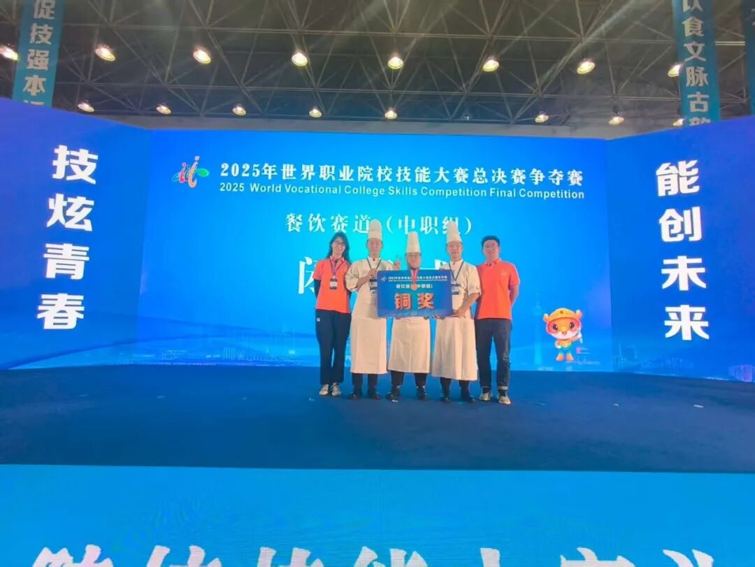 在刚刚落幕的2025年世界职业院校技能大赛餐饮赛道(中职组)总决赛中,由贾彦东和李羽琦两位老师指导的常俊、郑浩天和康磊3位同学组成参赛队,凭借精湛的厨艺和默契的配合,以出色的表现从全国32个省共80支队伍中脱颖而出,以小组第四名的优异成绩荣获铜奖,为学校再添世赛奖牌。