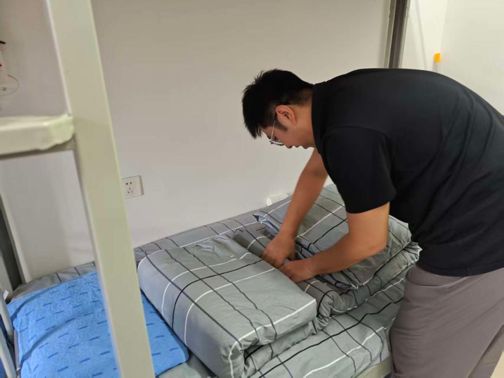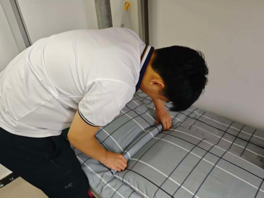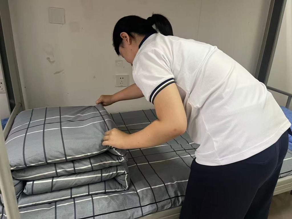 “叠被子看似简单,想要叠出方方正正的‘豆腐块’,可得讲究技巧。”在一间新生宿舍内,辅导员一边平铺被子,一边向围坐的新生讲解步骤,“先把被子压平,找到横向中线对折,再把两边向中间折,注意边角要对齐,最后慢慢调整棱角。” 为了让新生更好地掌握技巧,辅导员反复演示,还亲手拿着新生的被子,一步步带领操作。起初,不少新生叠出的被子要么形状松散,要么折痕歪斜,面对 “不听话”的被子有些手足无措。但在辅导员的耐心指导下,大家逐渐找到窍门,有的新生对照辅导员的示范视频反复练习,有的互相帮忙检查调整,宿舍里不时响起 “这里再捏一下棱角”“物品要分类放在物品箱里”的交流声。