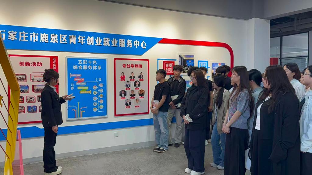 在6层石家庄市鹿泉区青年创业就业服务中心,讲解员介绍了“创训营”“创业沙拉”“投融资对接会” 等特色活动,展示中心为青年创客提供的全方位资源交流与对接服务。同学们认真聆听、积极互动,深切感受浓厚的创新创业氛围,进一步点燃创业梦想。
