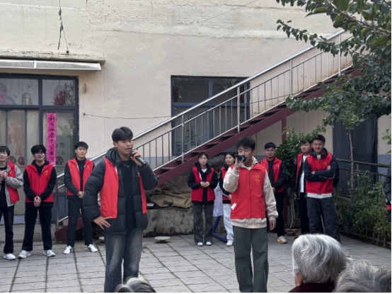 卫生清扫后,辅导员牵头组织趣味互动。“猜谜语”“击鼓传花”让活动室充满欢声笑语,辅导员为听力不佳的老人提高音量念谜面,坐在老人身边倾听往昔故事、拉家常问冷暖。随后,辅导员带领同学们献上秧歌舞表演,不时为老人递上热水,最后全体师生与老人齐声合唱《歌唱祖国》,氛围热烈温馨。