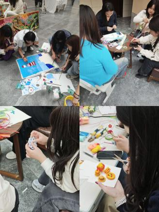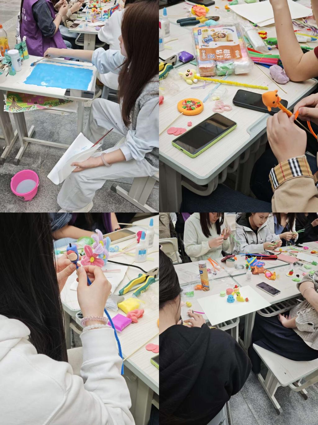 创作环节中,同学们充分发挥专业素养与想象力,沉浸式开启手工与绘画创作。大家三两结伴,有的同学轻柔揉捏黏土,将其塑造成憨态可掬的小动物、娇艳的花朵与童趣的小家园,用指尖勾勒美好;有的同学执笔作画,在画纸上肆意挥洒色彩,描绘校园美景与未来憧憬,让学业压力随色彩消散;还有的同学专注摆弄扭扭棒,通过弯折、缠绕、拼接,将普通材料变成精致的发箍、小花束与创意摆件,每一件作品都饱含巧思。